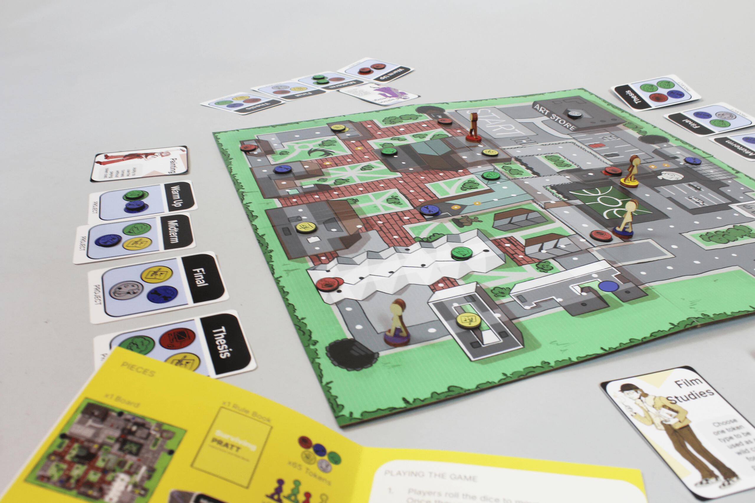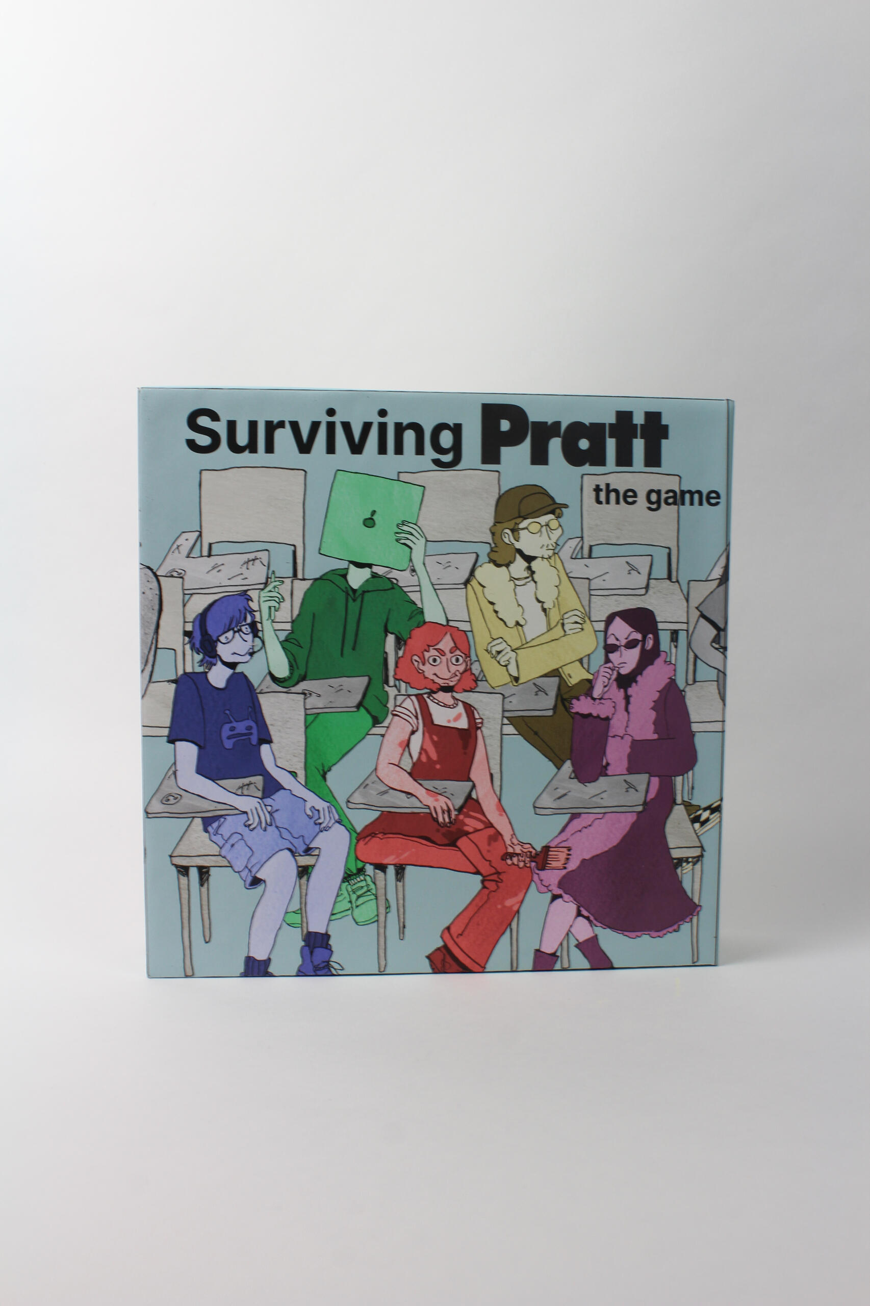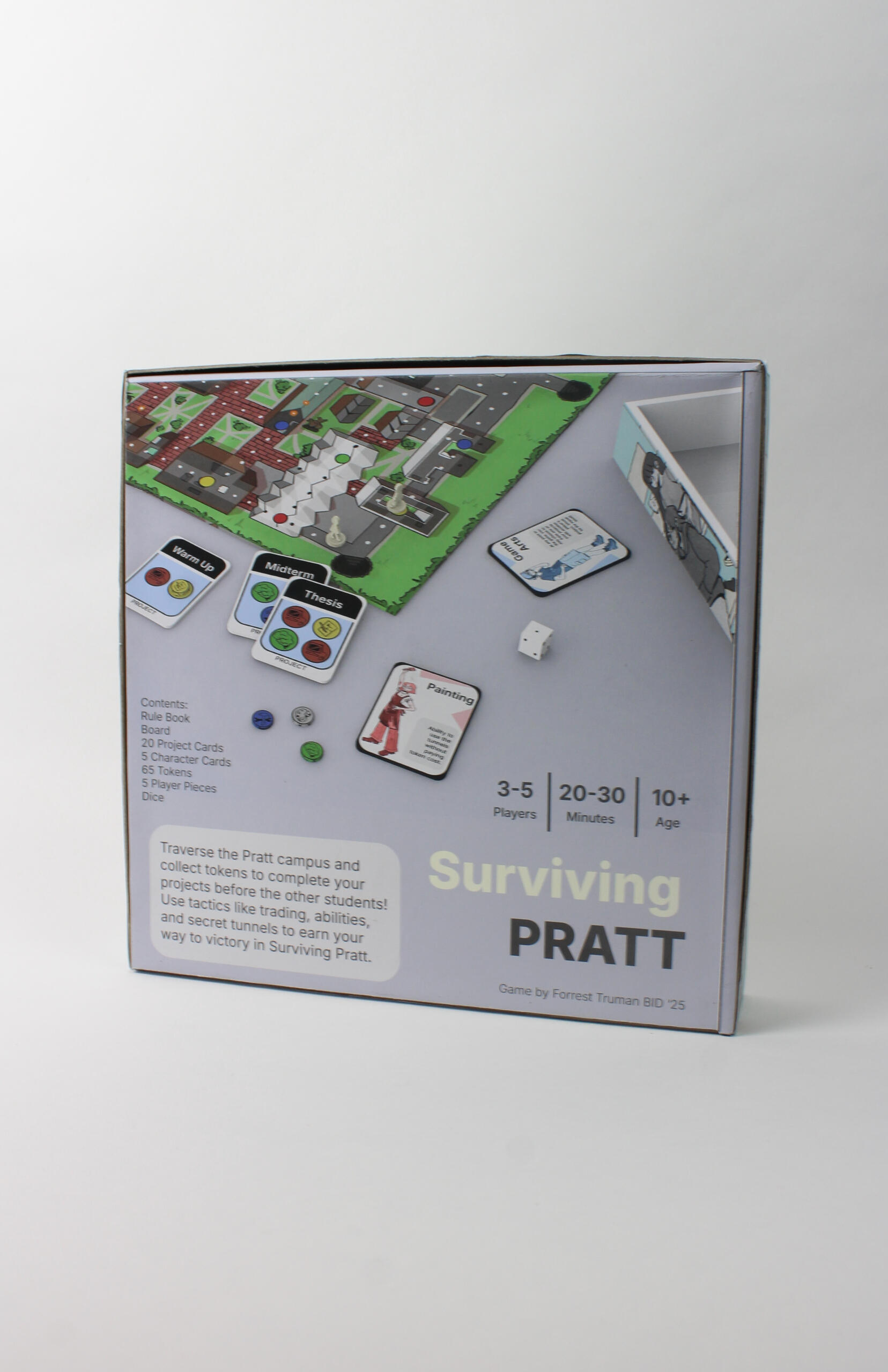 OverviewSurviving Pratt is a board game where players traverse the Pratt Institute campus in search of tokens to complete projects. They are able to play as five of the different majors offered at Pratt with unique abilities. The game is aimed to be family friendly and easy to learn quickly.Box and character illustrations done by Annie Kennedy. Her work can be found at aekennedy.comTimeline: September-November 2024