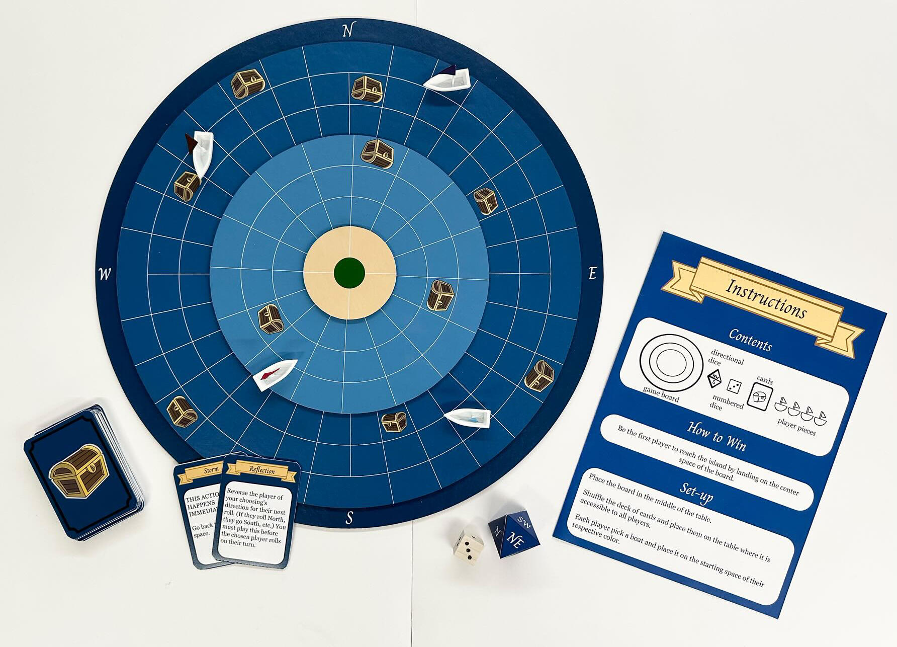 Overview'Compass' is a collaborative effort by Forrest Truman, Jessie Duit, and Chloe Liu. It is a board game that utilizes the directions of a compass to introduce a new way of moving players on a board. It also includes a multi-layered, rotating board for more interesting gameplay.Timeline: October 2023
