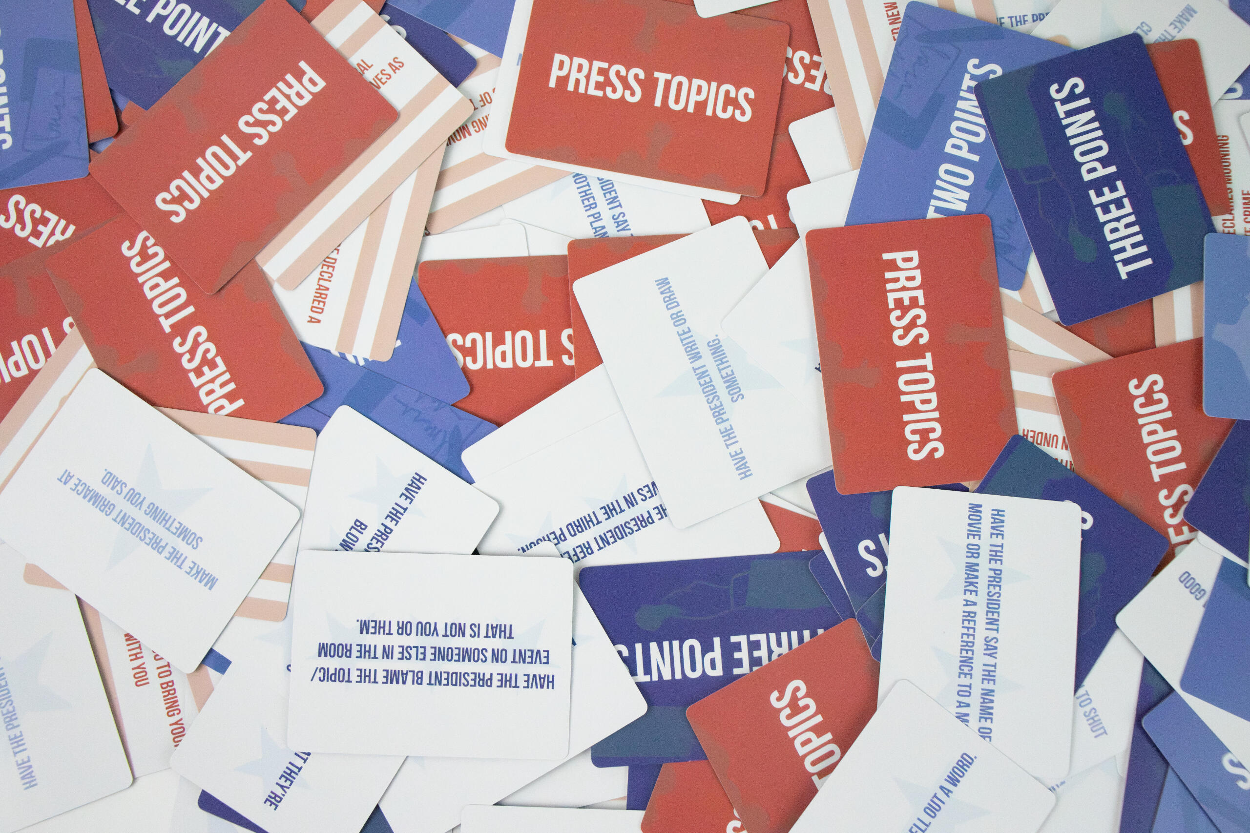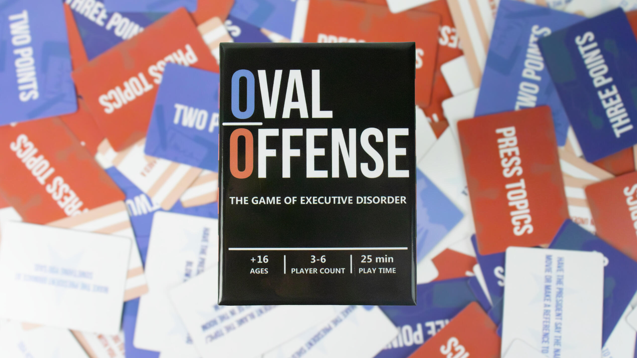 OverviewOval Offense is a party card game that has players reenact press briefings that would occur in the White House. The game is full of silly and fantastical topics and creates chaos among all of the players.Timeline: January - May 2025